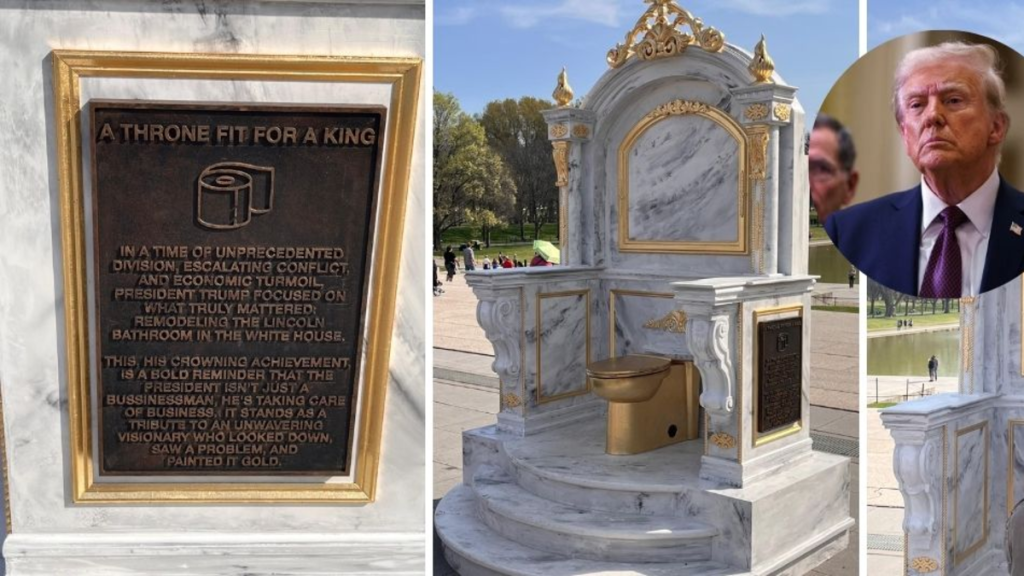La instalación es una crítica directa al presidente Donald Trump y juega con dos ideas que han marcado su segundo mandato. Por un lado, la reciente remodelación del llamado “baño Lincoln” en la Casa Blanca, anunciada en octubre, en la que se reemplazaron elementos de los años cuarenta por acabados en mármol pulido y accesorios dorados.